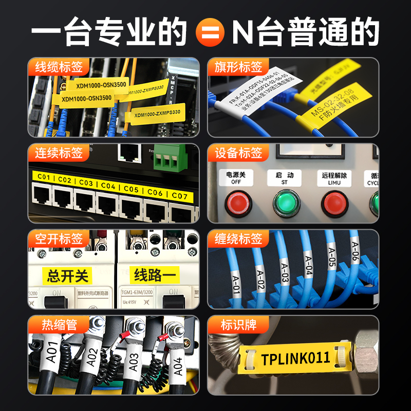 碩方標簽打印機G系列打印材料包括:線纜旗形標簽(刀型、F型標簽)、纏繞式標簽、間隙標簽、連續標簽,15*60mm的軟質標識牌,黃、白兩色9mm及15mm兩種規格的熱縮管,收縮比例約為2:1。