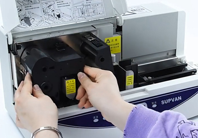 1.打開碩方標牌機SP650的右側外殼,推動左側上蓋按鈕,然后打開左側上蓋;