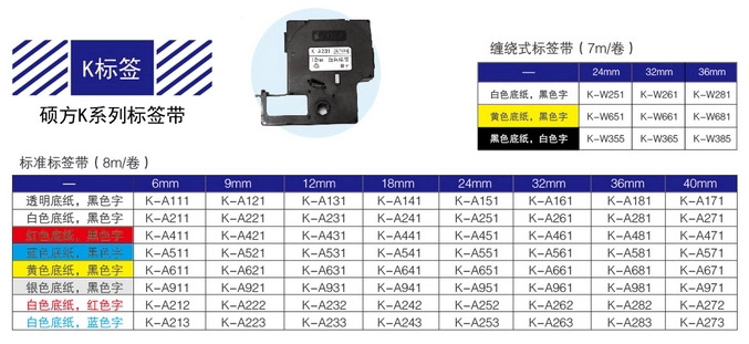 標(biāo)簽機(jī)色帶有6、9、12、18、24、32、36、40mm8種寬度多種顏色